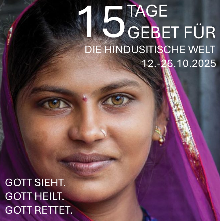 Bitte betet mit! Vom 12. bis 26. Oktober stehen Christen weltweit für die hinduistische Welt im Gebet ein. Besonders für die vielen Menschen dieser Weltgegend, die noch nie das Evangelium gehört haben. Über den Link unten könnt ihr das aktuelle Gebetsheft für 2025 herunterladen. Bitte teilt es in eurer Gemeinde und in Gebetskreisen und betet mit. Die Menschen in den Ländern Südasiens brauchen das Evangelium.